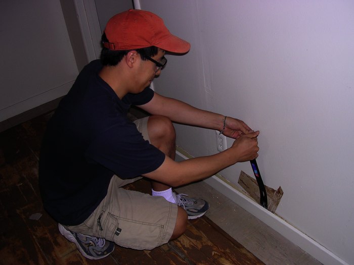Chris removes the baseboard molding in our kitchen so we can lay the new flooring.