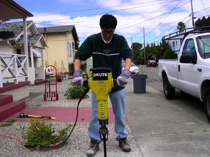 Here's the model we settle on. It's a 64 lb beast that makes short work of the 4 inch concrete. It takes about 4-5 hours of jackhammering to remove the 200 sq ft of concrete.