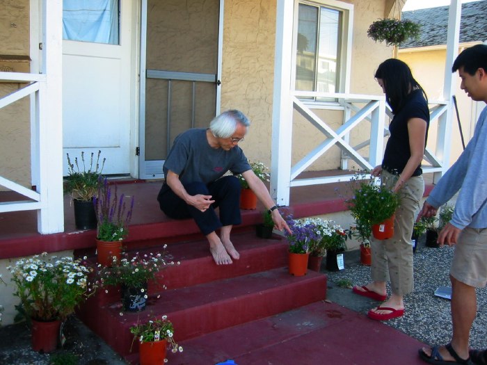 Shirley's dad supervises our initial gardening effort: how to arrange all the flower containers on the concrete front yard.